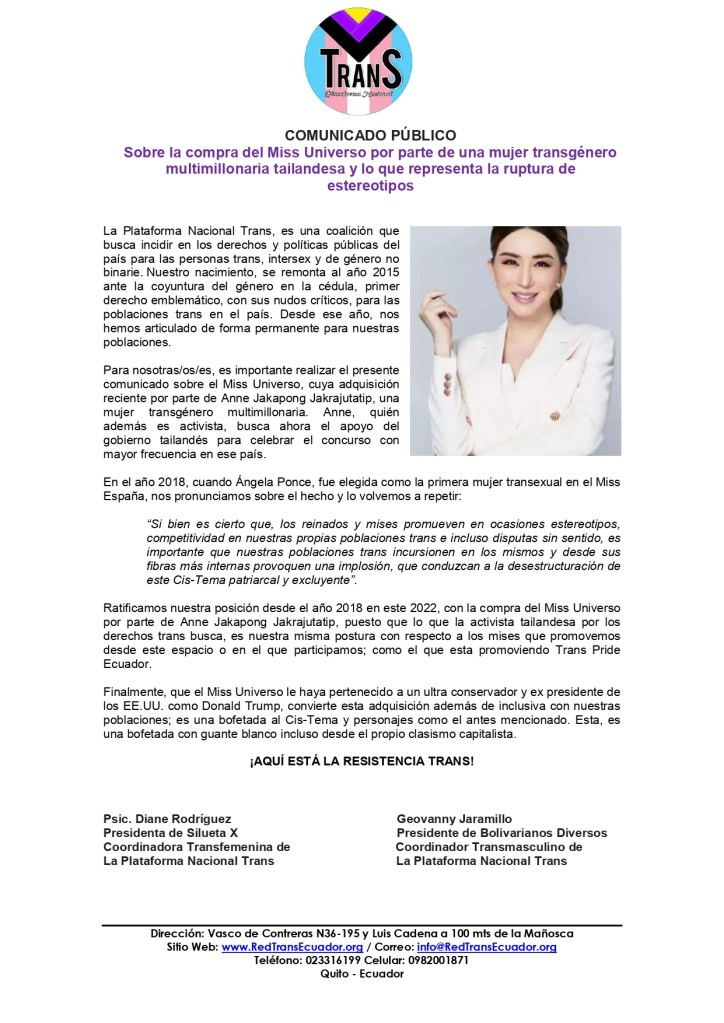 Ratificamos nuestra posición desde el año 2018 en este 2022, con la compra del Miss Universo por parte de Anne Jakapong Jakrajutatip, puesto que lo que la activista tailandesa por los derechos trans busca, es nuestra misma postura con respecto a los mises que promovemos desde este espacio o en el que participamos; como el que esta promoviendo Trans Pride Ecuador.